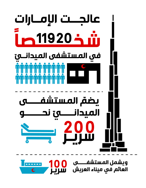 كذلك، أنشأت الإمارات مستشفيين ميدانيّين لمساعدة الفلسطينيّين. الأوّل داخل القطاع نفسه وهو الأكبر من نوعه بين المستشفيات الميدانيّة الأخرى إذ يشتمل على نحو 200 سرير لمعالجة المرضى والجرحى بحسب صحيفة "ذا ناشونال". ومن جملة الخدمات الصحّيّة المقدّمة أيضاً، طبّ الأسنان وطبّ العائلة وطبّ الأطفال وطبّ النساء والأشعّة المقطعيّة وغيرها. أمّا المستشفى الثاني فعبارة عن مستشفى عائم قبالة ساحل مدينة العريش ويضمّ 100 سرير. وقدّمت الإمارات العلاج لـ11920 شخصاً في المستشفى الميدانيّ وأجرت خلال الأسبوع الماضي وحده عمليّات جراحيّة لـ1099 مصاباً بحسب الموقع الإلكترونيّ لـ"الفارس الشّهم 3".