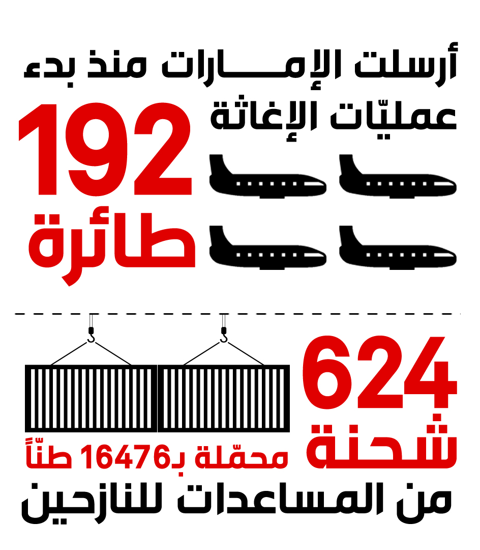 انطلقت الشهر الماضي من الإمارات سفينة إغاثيّة ثالثة حاملة نحو 4630 طنّاً من المساعدات الإنسانيّة للفلسطينيّين، بين ما هو طبّيّ وإيوائيّ وغذائيّ ولوجستيّ. ووصلت إلى مدينة العريش في وقت سابق من الشهر الحاليّ. كما افتتحت الإمارات 6 محطّات تحلية للمياه في مدينة رفح المصرية تنتج نحو 1.2 مليون غالون من الماء يوميّاً لنقلها إلى القطاع حيث يستفيد منها 600 ألف نسمة. هذا وأرسلت الإمارات 5 مخابز أوتوماتيكيّة إلى مدينة العريش تمهيداً لنقلها إلى القطاع ومن المتوقّع أن تلبّي الاحتياجات اليوميّة لأكثر من 420 ألف شخص عند تشغيلها.