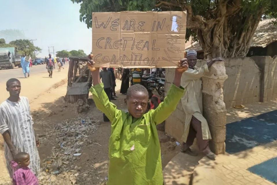 صبي يحمل لافتة احتجاجا على اختطاف مسلحين للطلاب في نيجيريا