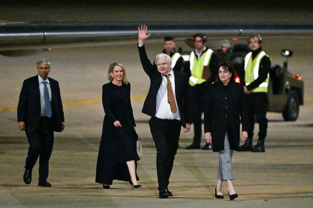 ونزل أسانج من طائرة خاصة في مطار كانبيرا بعد الساعة 7:30 مساء بقليل (1130 بتوقيت غرينتش)، وهو يلوح لوسائل الإعلام المنتظرة قبل أن يقبل زوجته ستيلا بلهفة ويرفعها عن الأرض.