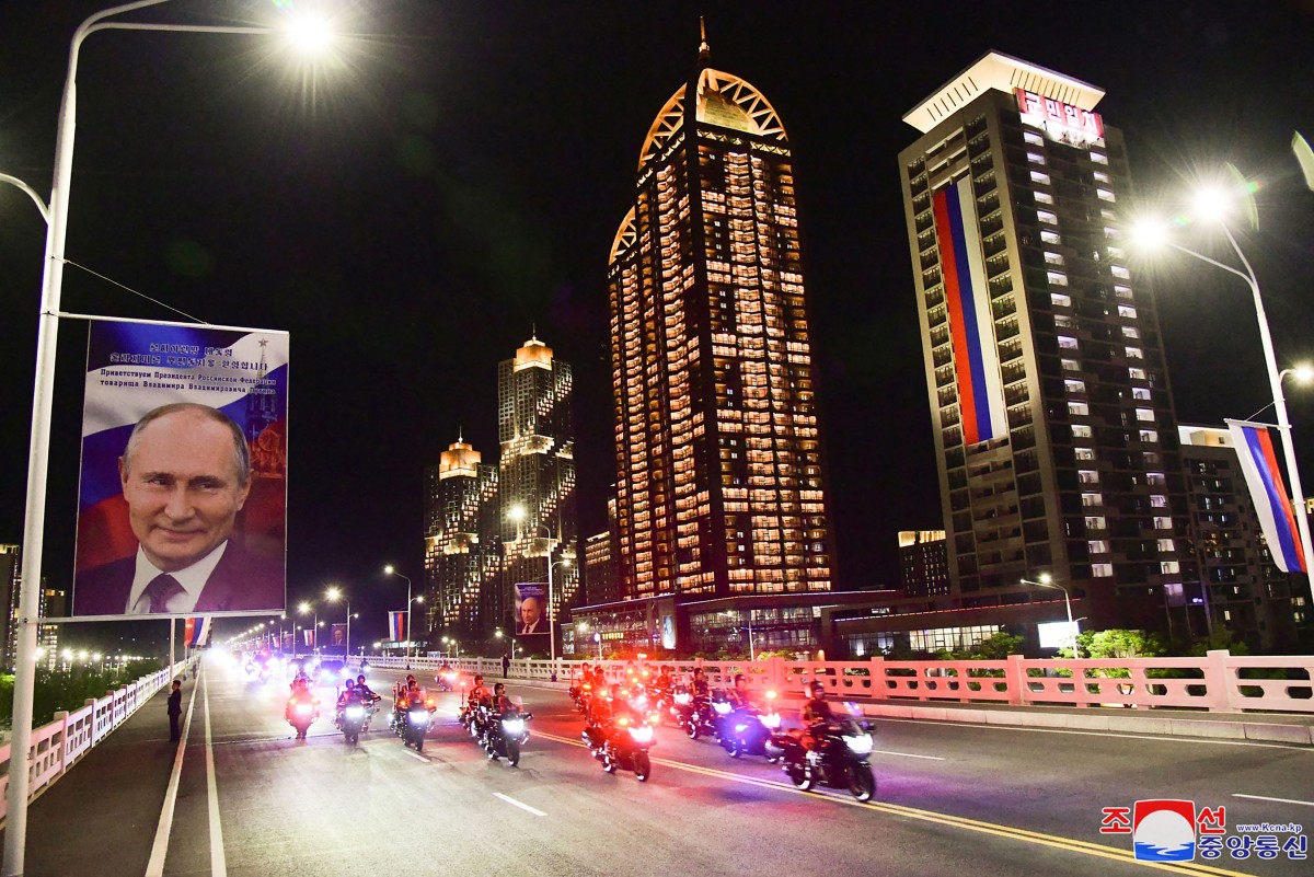 استقبلت حشود مبتهجة واحتفالات تتسّم بالفخامة الرئيس الروسي، وأظهر مقطع مصوّر بثته وسائل إعلام روسية حرس شرف يضم جنوداً وحشداً كبيراً من المدنييّن يتجمعون في الساحة الواقعة على ضفة نهر تايدونغ الذي يمر عبر العاصمة الكورية الشمالية.