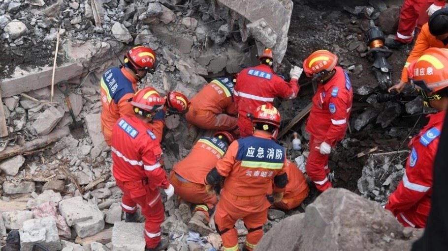 صورة من الأرشيف لعمال إغاثة يبحثون عن ناجين وسط الأنقاض بعد انهيار أرضي في جنوب غرب الصين