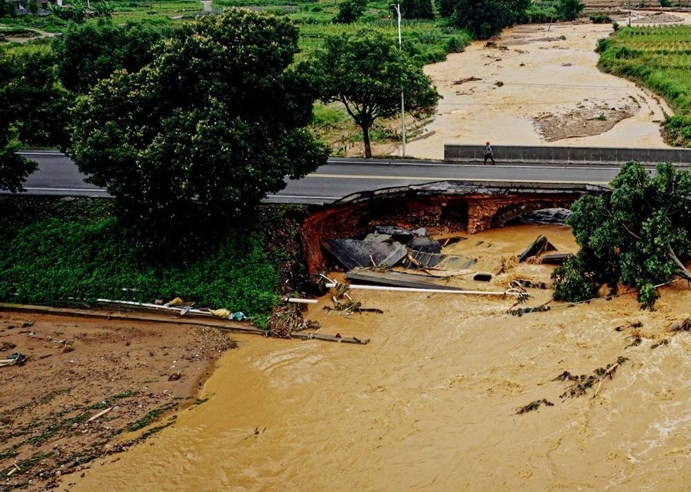 أشخاص يسيرون على جسر متضرر بعد العواصف في لونغيان بمقاطعة فوجيان شرق الصين. (أ ف ب)