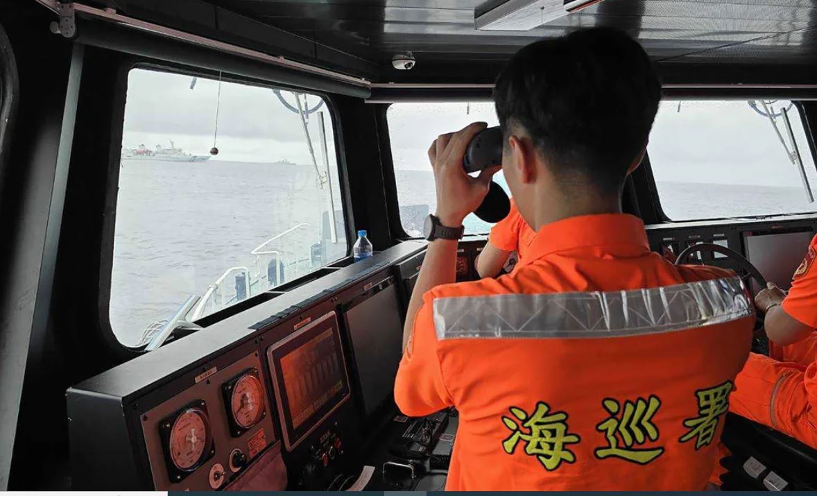 أحد أعضاء خفر السواحل التايواني يراقب سفينة تابعة للبحرية الصينية تعمل بالقرب من جزيرة بنغجيا شمال تايوان