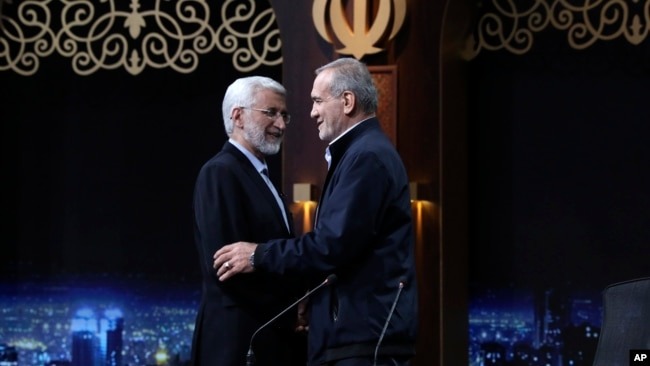(جليلي وبيزشكيان يتصافحان في نهاية مناظرة رئاسية)