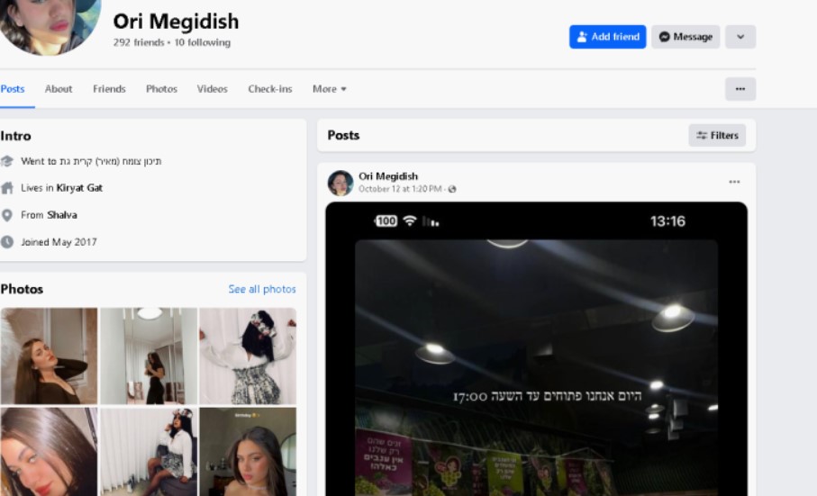 كما نشر ناشطون على وسائل التواصل الاجتماعي ما قالوا إنَّها صورة لصفحة المجندة على تطبيق فايسبوك وتظهر أنها نشرت تعليقا يوم 12 تشرين الأول (أكتوبر) الجاري، أي بعد 5 أيام من معركة طوفان الأقصى، مما يظهر أنها لم تكن ضمن أسرى "كتائب القسام".