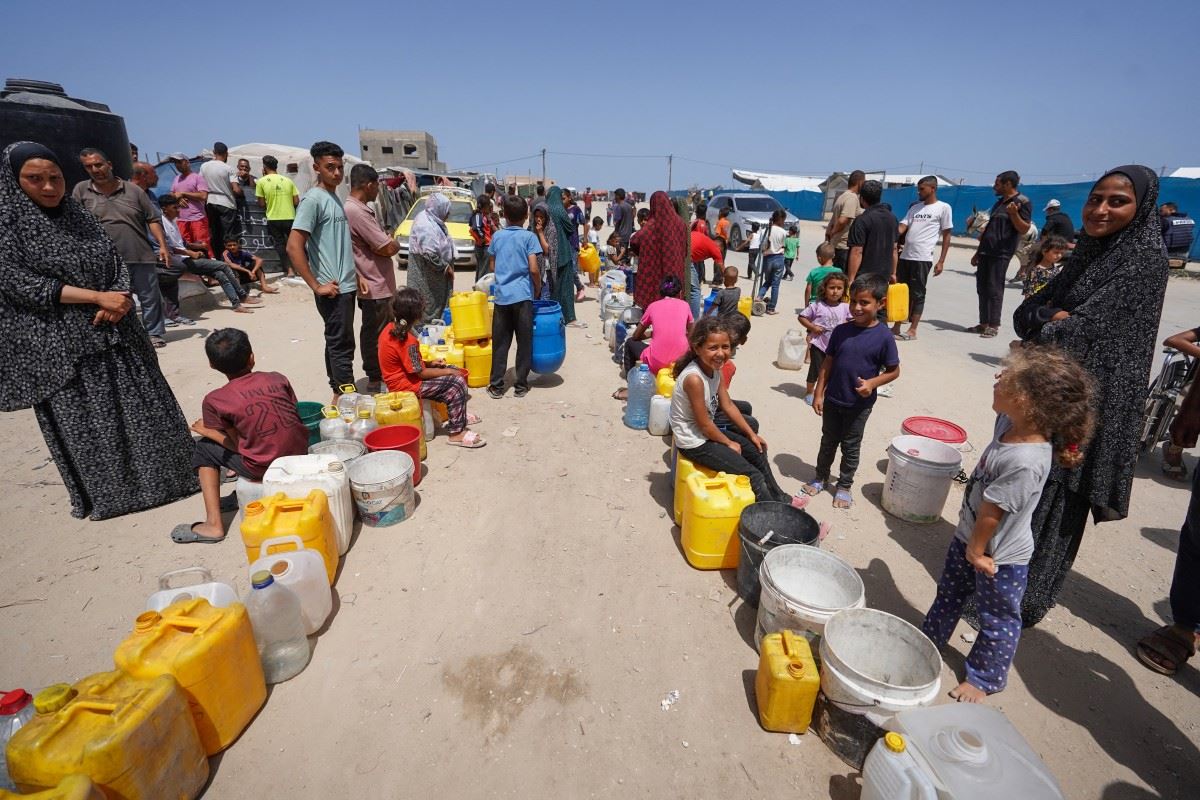 فلسطينيون بنتظرون تعبئة المياه في دير البلح. (أ ف ب)