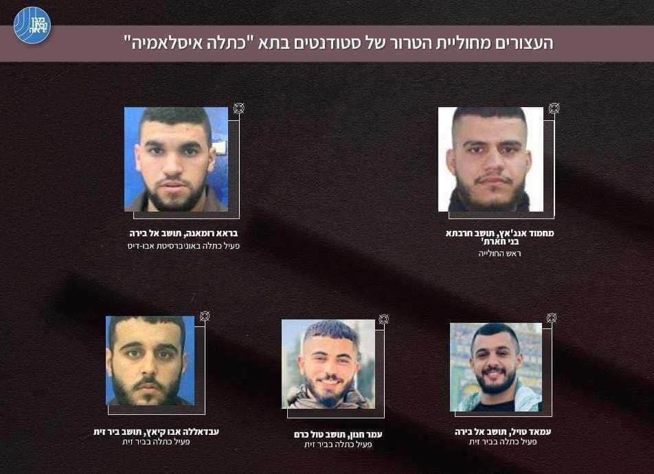 أعلن جهاز الأمن العام الإسرائيلي (الشاباك)، في بيان اليوم الأحد، أنه في عملية مشتركة مع الجيش والشرطة تم اعتقال خلية مكونة من طلاب أعضاء في "حماس" في جامعة بيرزيت (قرب رام الله في الضفة الغربية)، وينتمون إلى ما يعرف باسم "الكتلة الإسلامية".