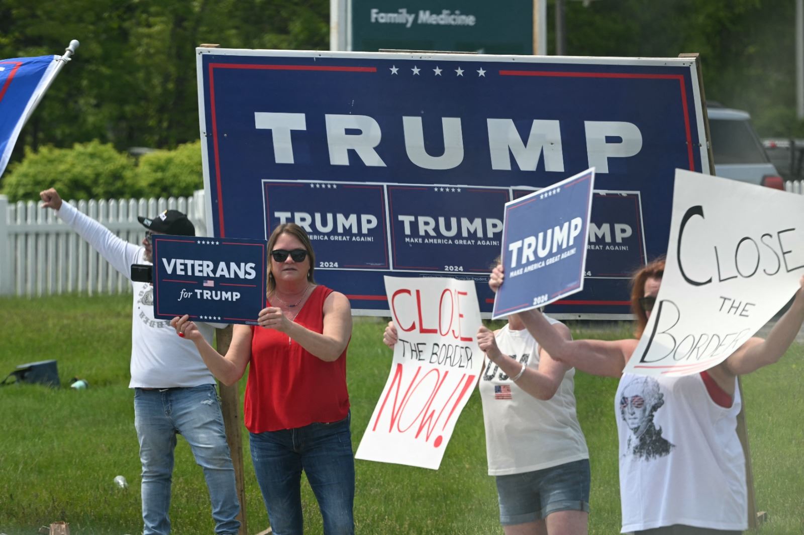 أنصار ترامب يحتجون بينما يغادر موكب المرشح الرئاسي الديمقراطي جو بايدن مطار مانشستر-بوسطن الإقليمي في نيو هامبشاير. (أ ف ب)