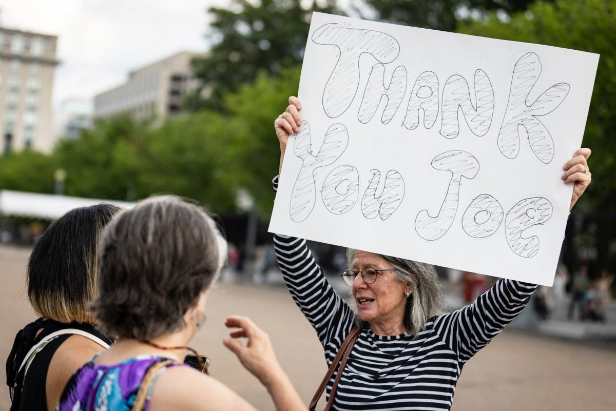 مؤيدة تشكر الرئيس جو بايدن أمام البيت الأبيض. (أ ف ب)
