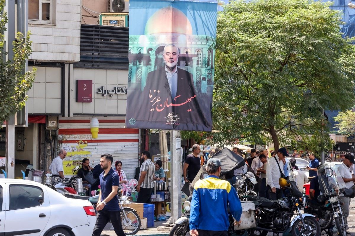 أشخاص يمرون أمام لافتة تحمل صورة الزعيم السياسي الراحل لحركة "حماس" إسماعيل هنية، الذي قُتل في هجوم أثناء وجوده في إيران، في طهران (أ ف ب).