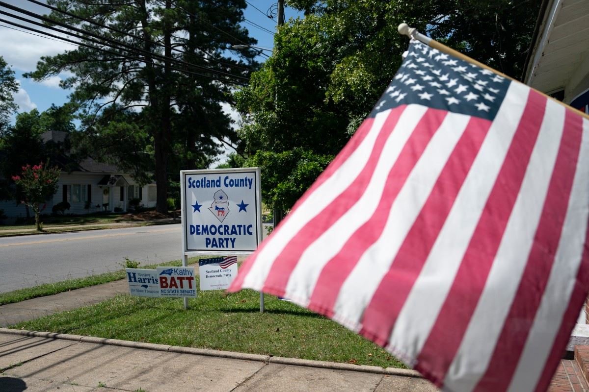 علم أميركا ولافتات بمقر الحزب الديمقراطي في نورث كارولينا (أ ف ب)