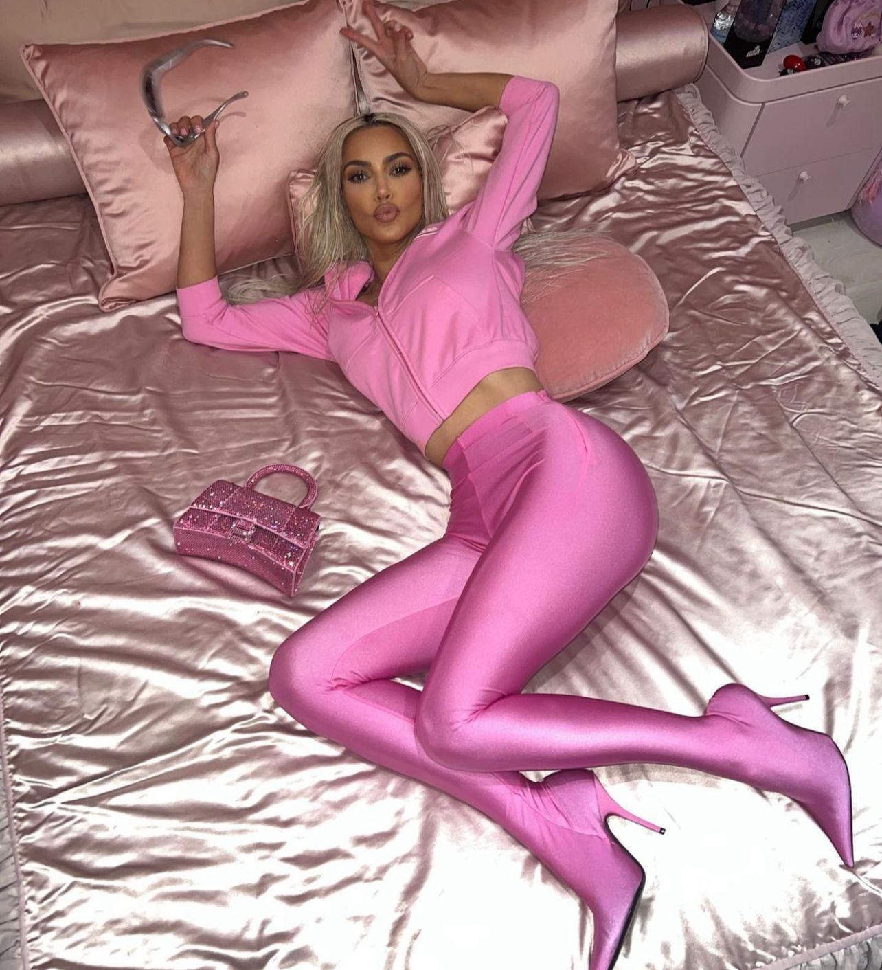 فقد شاركت كيم كارداشيان مجموعة من الصور على "إنستغرام، حيث كُتب: pics by north وهي ترتدي سترة ورديَّة اللَّون، مع سروال ضيّق وكعب متناسق من Balenciaga باللَّون الوردي أيضاً وحقيبة منSKIMS.