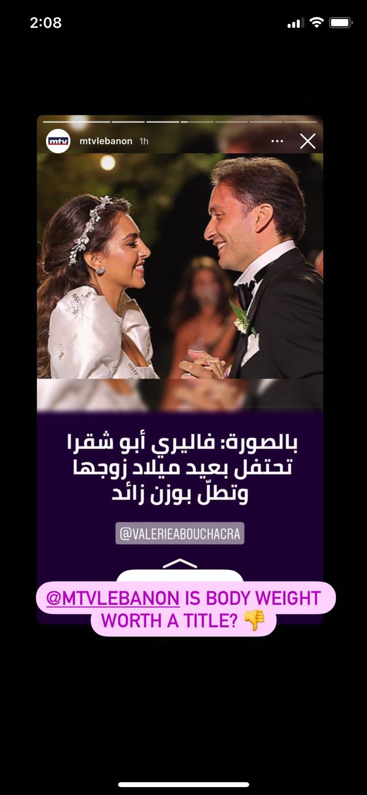 أمر دفع فاليري، إلى انتقاد الخبر، عبر حسابها على تطبيق إنستغرام، وذلك من خلال خاصّية الستوري، وقالت فيه: "هل وزن الشخص يستحقّ أن يكون عنواناً".