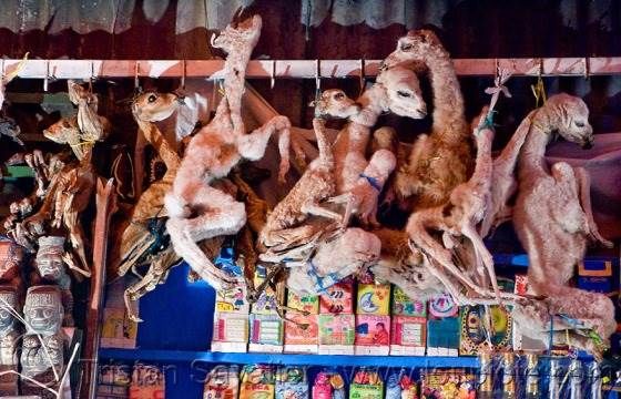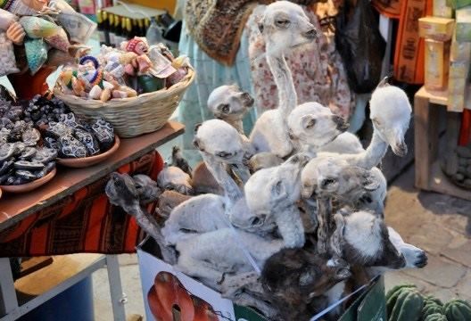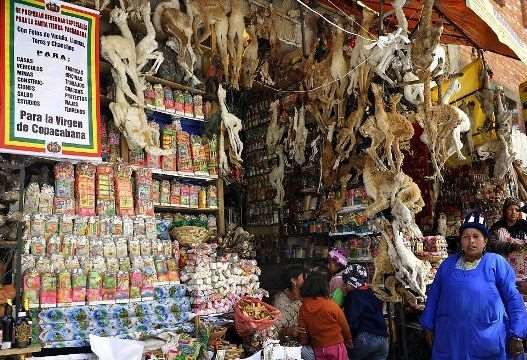 أجنة اللاما والضفادع المجفّفة والبوم المتدلّي، هي من الأمور التي يراها الزوّار في معظم الأكشاك في سوق الساحرات في مدينة لاباز.