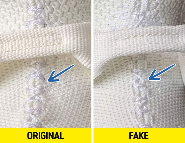 ستختلف جودة الموادّ الأصلية الباهظة الثمن أيضاً حين تكون خيوط الحياكة في المنتجات الأصليّة أقوى وأنظف. على عكس الملابس المقلّدة، تكون نسبة الخيوط في الملابس والأحذية الأصلية - في الأغلب - أكثر كثافة في كلّ سنتيمتر مربّع، كما لن تكون الخطوط مستقيمة أيضاً، لأنّها تميل إلى استخدام موادّ أقلّ لخفض التكلفة.