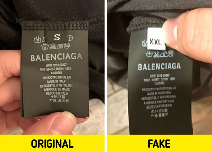 سيكون ملصق المقاس مختلف اللون، وأقلّ جودة، مقارنة بالملابس الأصليّة. وقد تجد المسافات بين الحروف مختلفة كذلك.