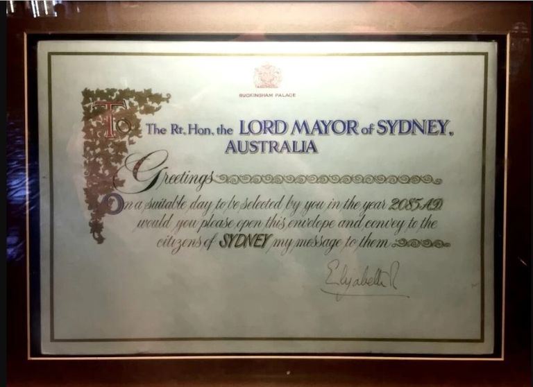 وكتبت الملكة على الرسالة الموجهة إلى "اللورد الصحيح والمحترم عمدة سيدني، أستراليا": "تحيات. في يوم مناسب يتم اختياره بواسطتك في عام 2085، افتح هذا الظرف وانقل رسالتي إلى مواطني سيدني".