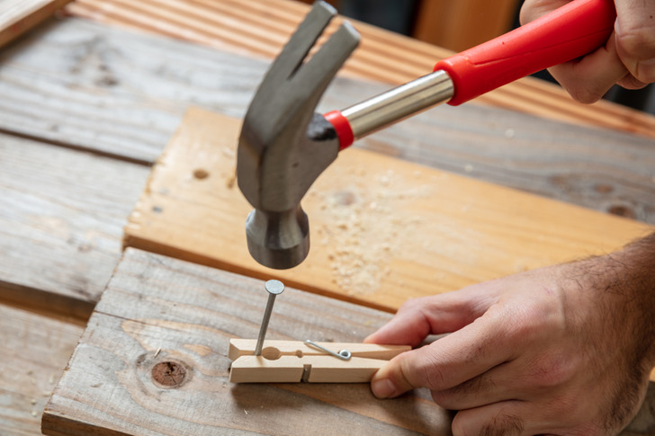 عادة ما يسبّب هذا الإجراء الإصابة، لكن دائماً هناك حلّ، حاول أن تثبّت المسمار بمشبك غسيل للتأكّد من أنّ أصابعك بعيدة عن "نقطة الضرب".