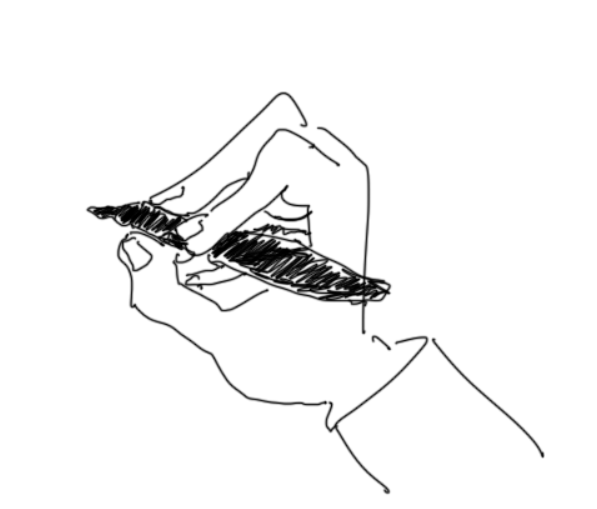 - ثلاثة أصابع، والقلم على آخر مفصل للإصبع الأوسط