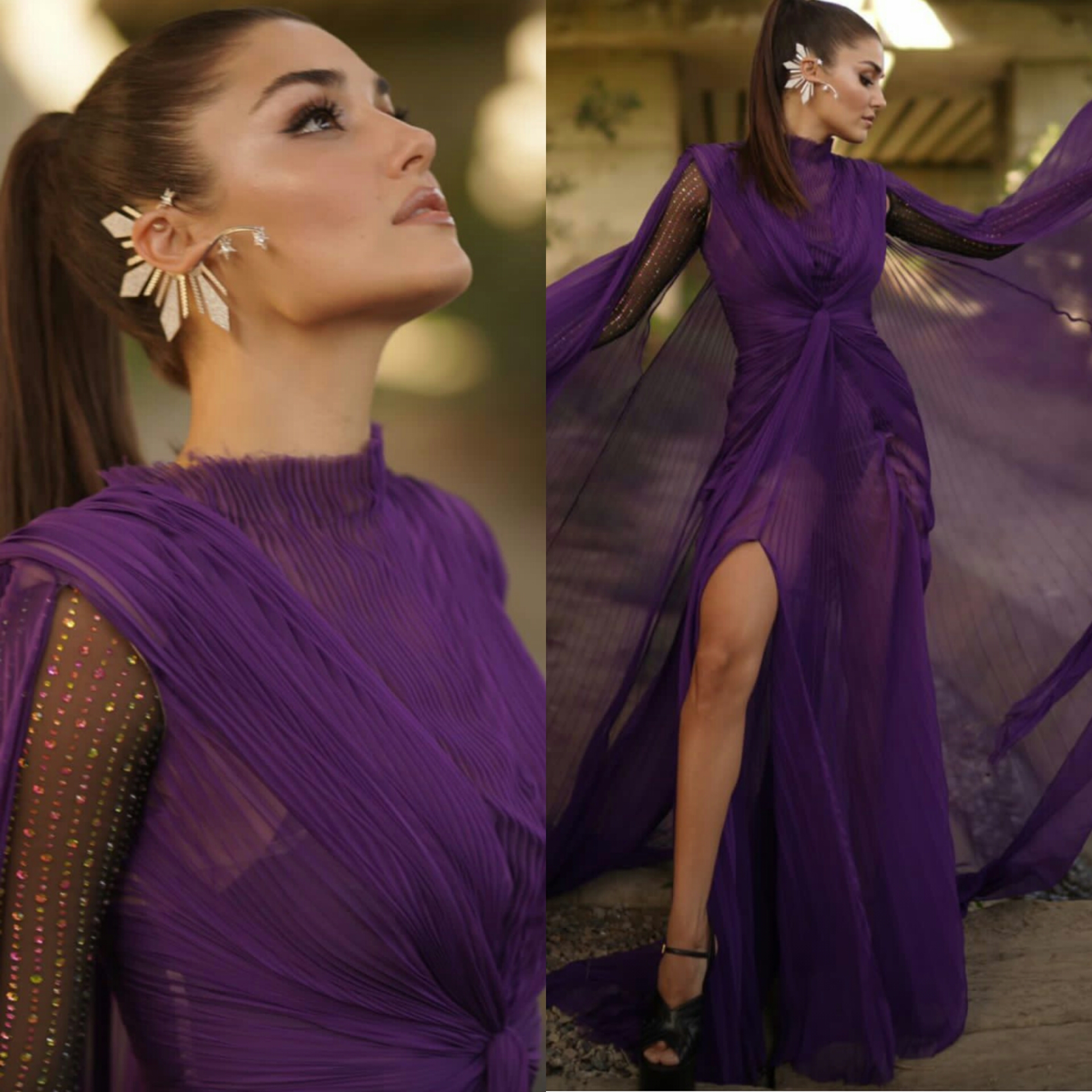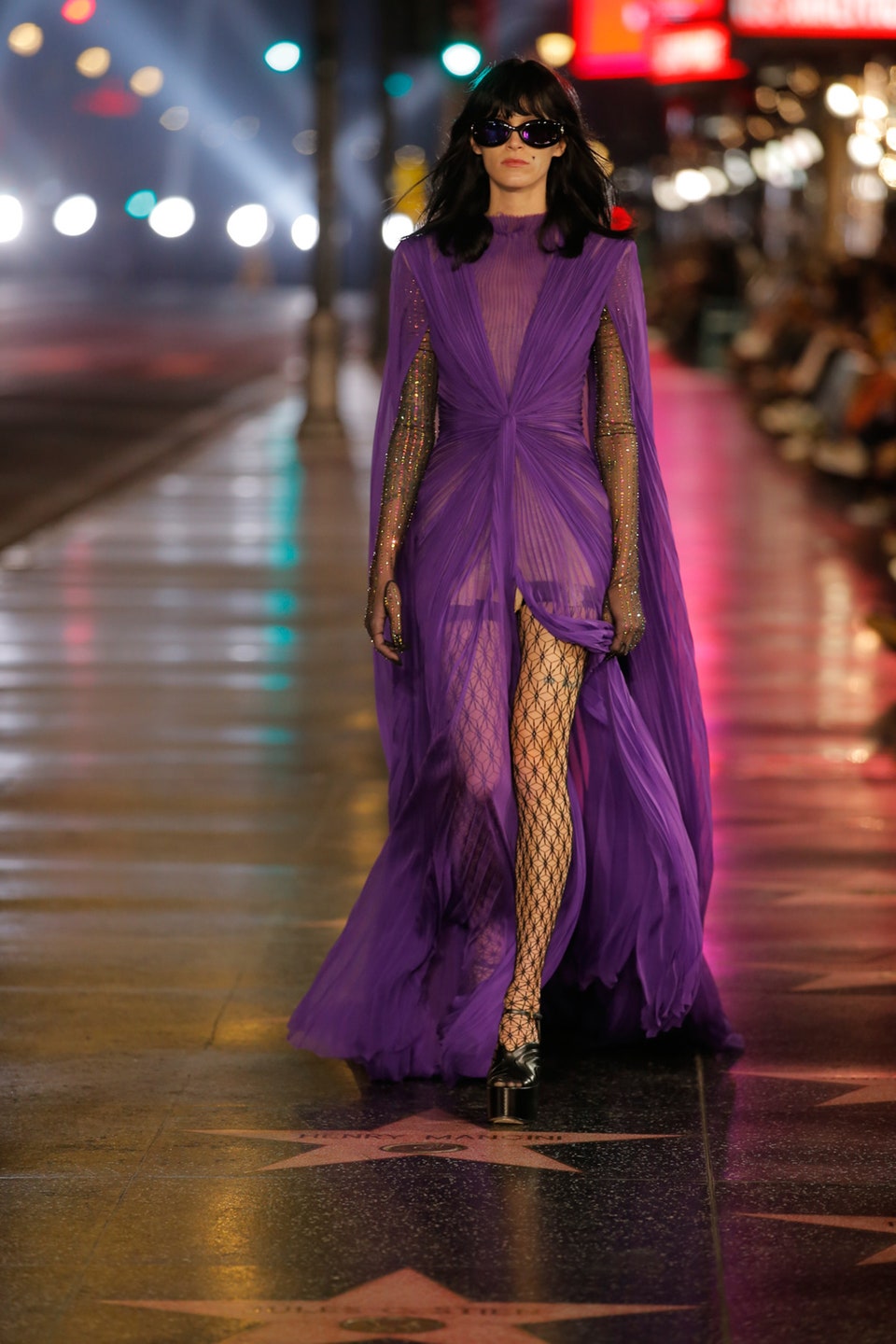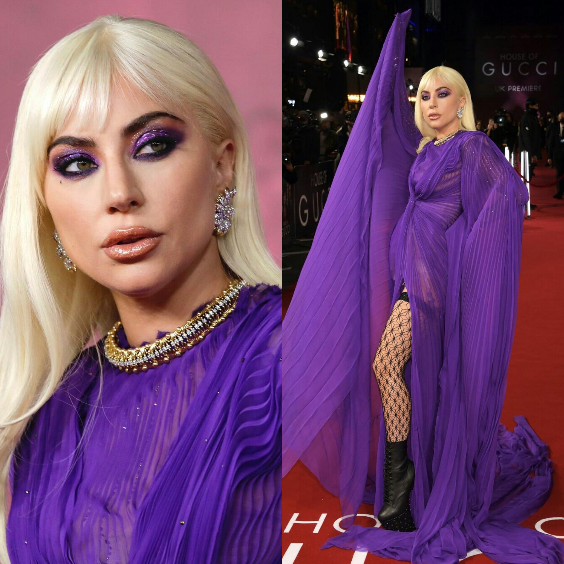 بفستان بنفسجي من الشيفون الحريري تكسوه طيات الـ draping وكاب انسيابي يتطاير كالنسيم، أطلت ليدي غاغا بإطلالة دراماتيكية في نوفمبر من عام 2021؛ أقرنتها بقفازات الأوبرا الشفافة ذات التفاصيل الكريستالية، إضافةً إلى جوارب عالية الفخذ شفافة من الدانتيل مرفقة بحذاء ضخم platform boots.