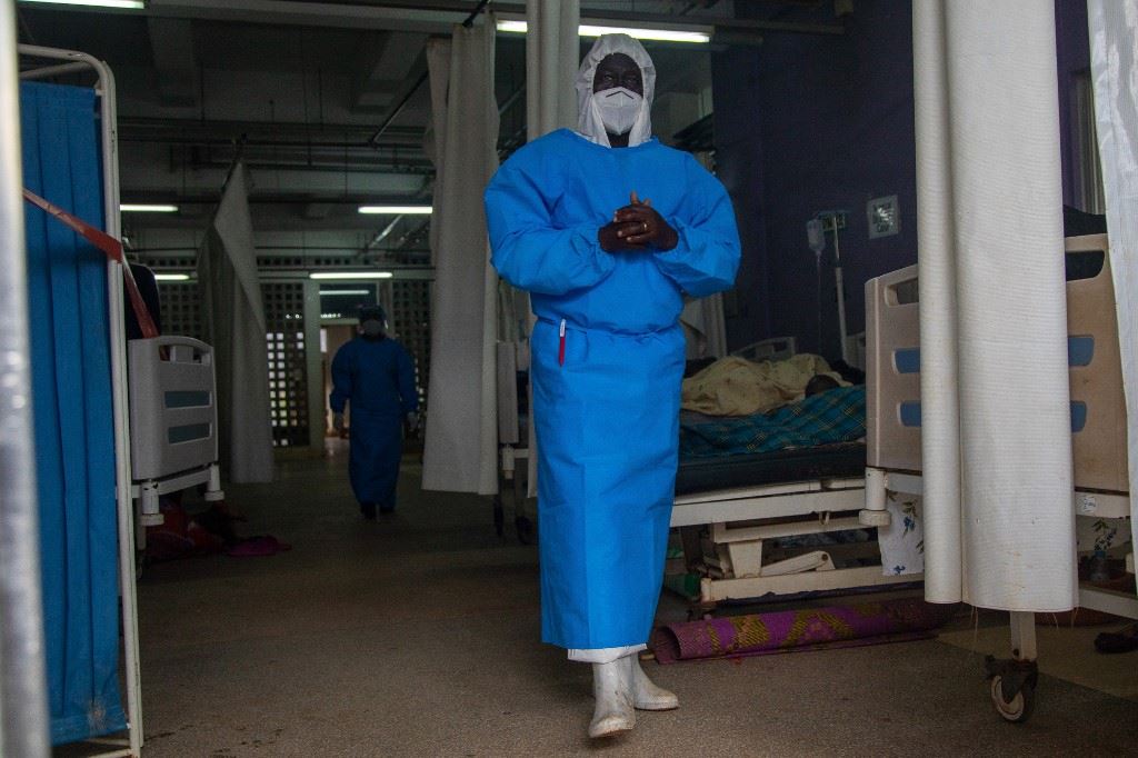 عضو من الطاقم الطبي الأوغندي لوحدة علاج الإيبولا يقف داخل الجناح في معدات الحماية الشخصية(أ ف ب)