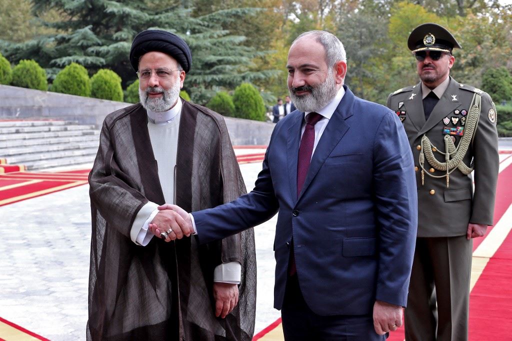 رئيسي (إلى اليسار) مستقبلا باشينيان في طهران (1 ت2 2022، أ ف ب).