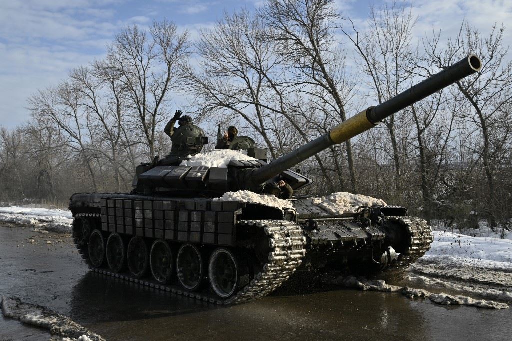 جنود أوكرانيون يركبون دبابة بالقرب من باخموت (أ ف ب).