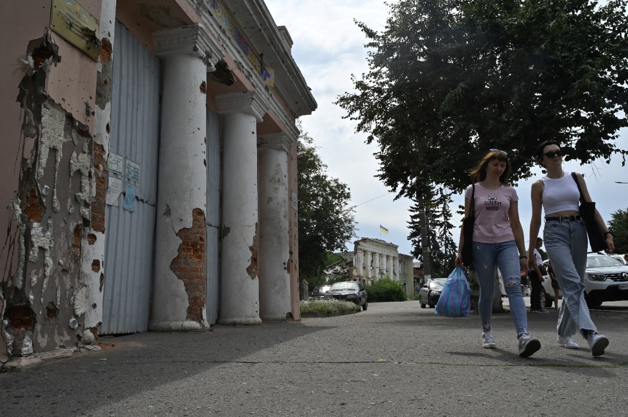 اشخاص يمرون قرب متجر مدمر في مدينة اوختيركا (1 آب 2022، أ ف ب).