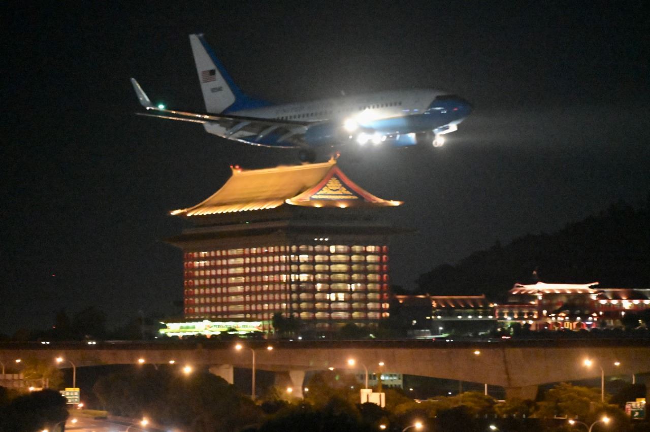 طائرة عسكرية أميركية على متنها بيلوسي تستعد للهبوط في مطار سونغشان في تايبيه (2 آب 2022، أ ف ب).