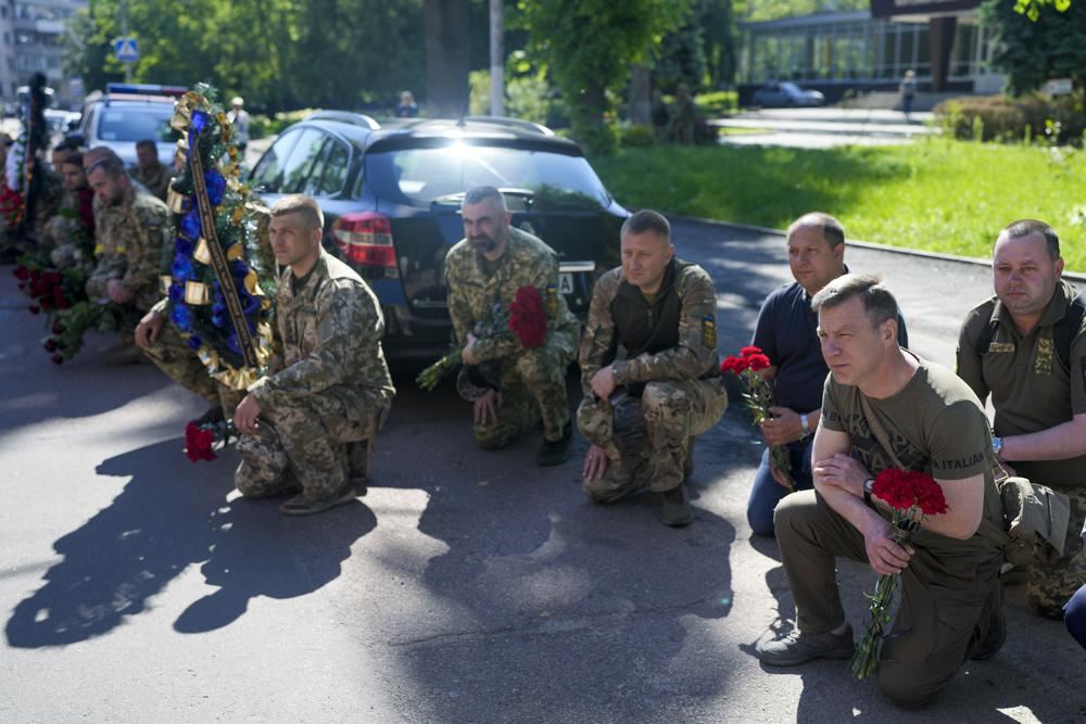 جنود أوكرانيون ركعوا خلال جنازة العقيد أولكسندر ماخاتشيك في جيتومير بأوكرانيا (3 حزيران 2022، أ ب).