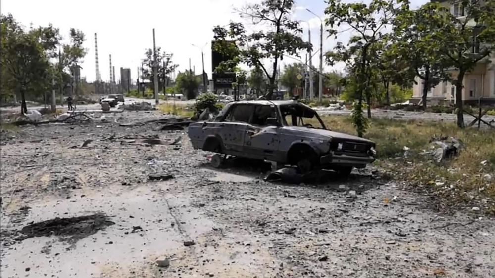 سيارات محترقة وأبنية سكنية متضررة في ليسيتشانسك بمنطقة لوغانسك بأوكرانيا (3 تموز 2022، أ ب).