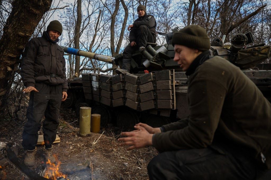 جنود أوكرانيون يدفئون أنفسهم في موقع قرب باخموت بمنطقة دونيتسك (30 ت2 2022، أ ف ب).