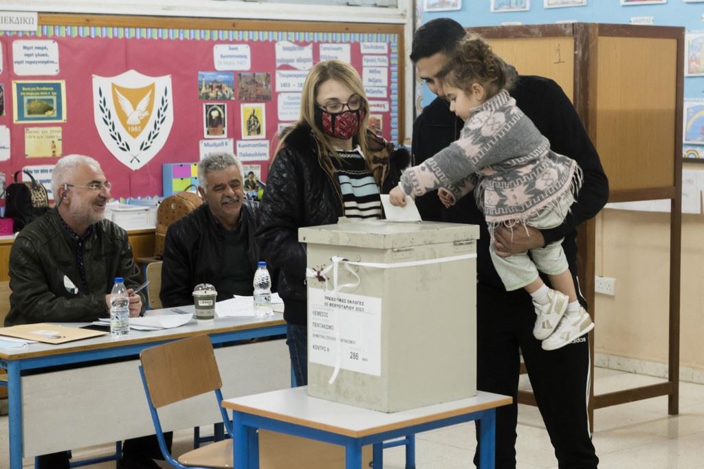 رجل قبرصي يحمل ابنته لتضع تصويته في الصندوق في مركز اقتراع في ليماسول (5 شباط 2023، أ ف ب).