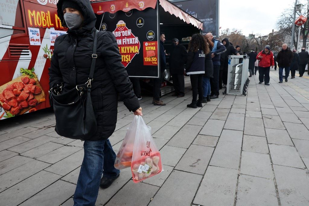 امرأة تغادر بعد شراء لحوم رخيصة باعتها بلدية أنقرة الحضرية (2 شباط 2023، أ ف ب).