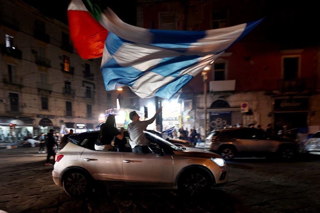 مشجعون لنادي نابولي يحتفلون بفوز نابولي بلقب "سكوديتو" الإيطالي بعد مباراة حاسمة في أوديني (4 أيار 2023، أ ف ب).