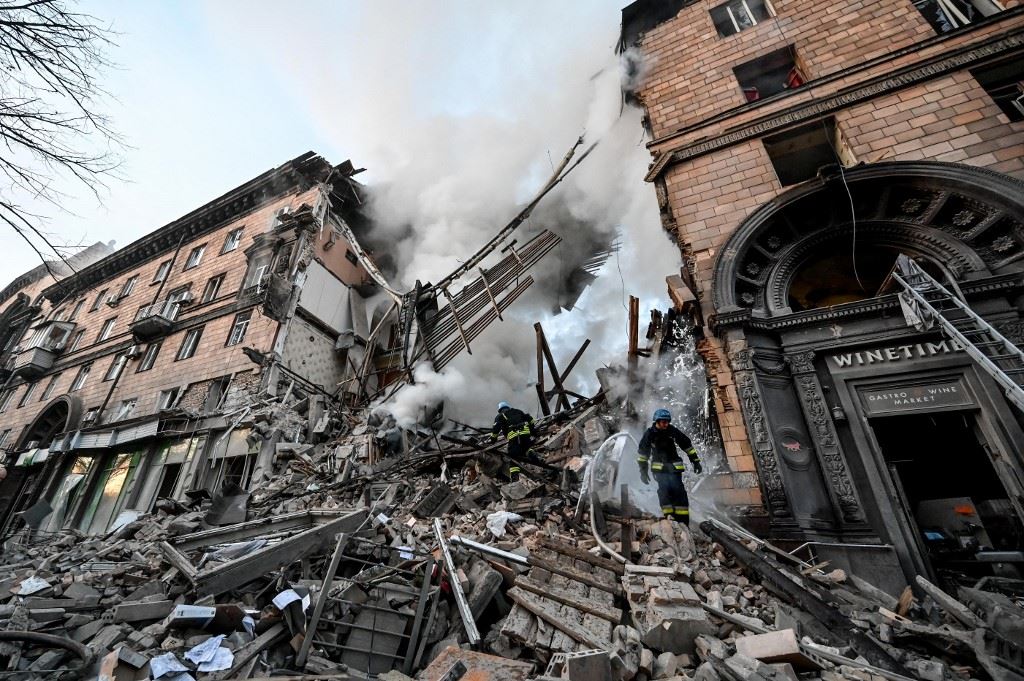 رجال إطفاء أوكرانيون يخمدون حريقًا بعد غارة في زابوريجيا (6 ت1 2022، أ ف ب).