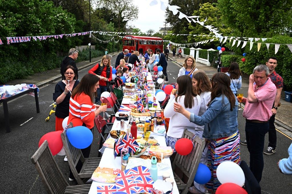 سكان يشاركون في حفلة في الشارع في تشيسويك غرب لندن كجزء من حفلات غداء التتويج (7 أيار 2023، أ ف ب).