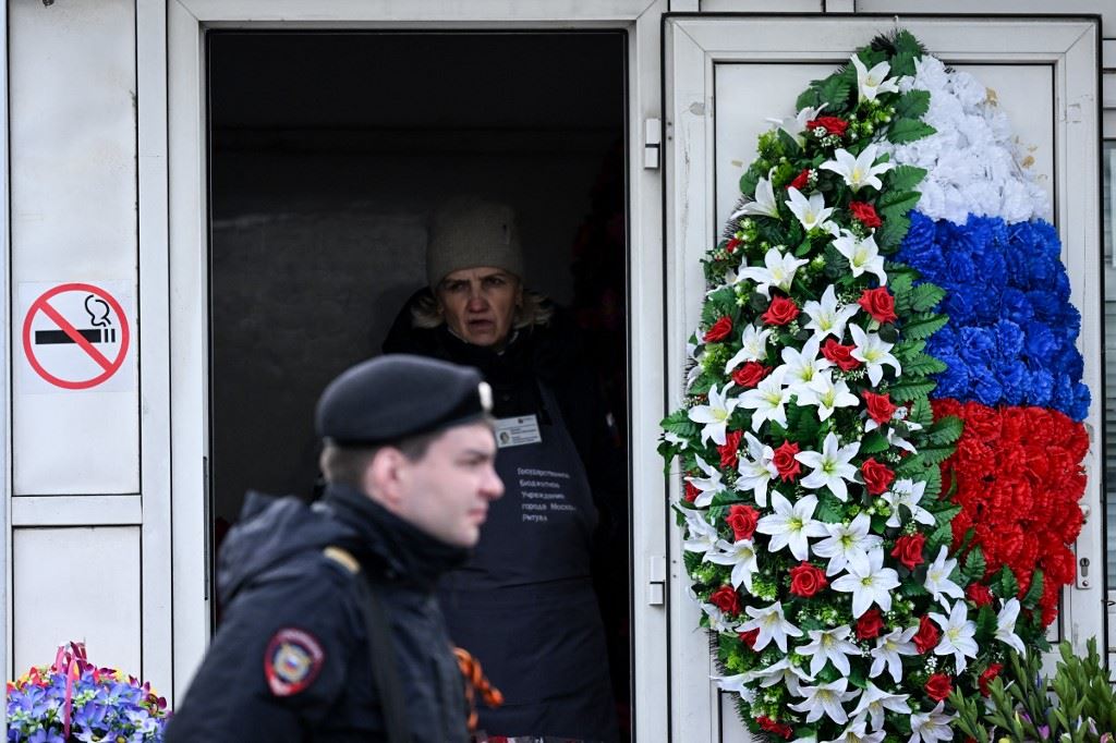 شرطي روسي يمر بجانب متجر في موسكو (6 أيار 2023، أ ف ب).