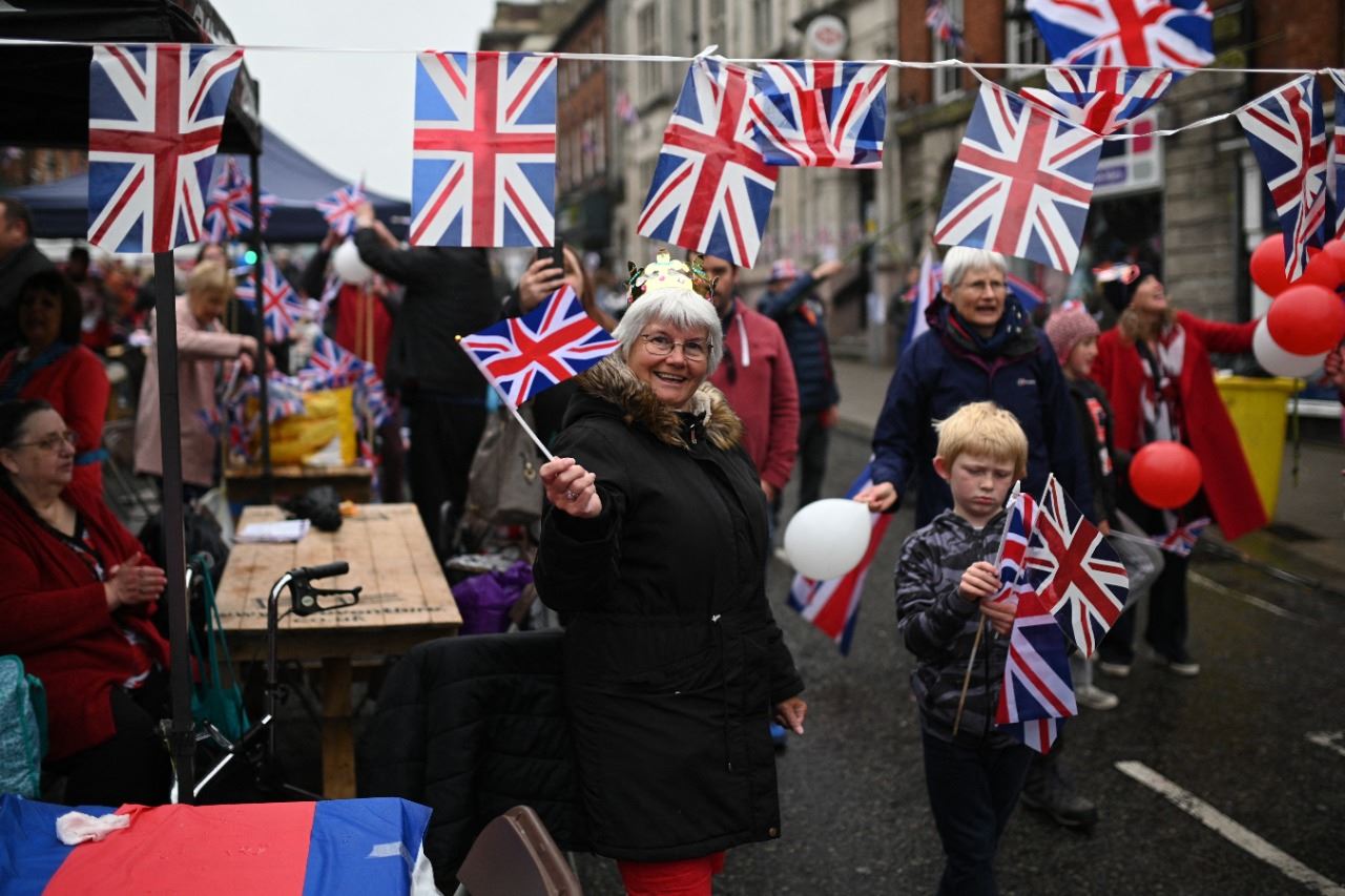امرأة تلوح بالعلم البريطاني خلال احتفال في الشارع في أشبي دي لا زوش وسط إنكلترا في اطار احتفالات اليوبيل البلاتيني للملكة إليزابيث الثانية (5 حزيران 2022، أ ف ب).