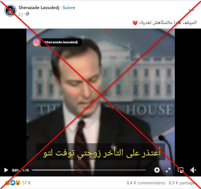 تداولت صفحات على مواقع التواصل الاجتماعي مقطع فيديو زعمت أنه مشهد حقيقي لمسؤول في البيت الأبيض وهو يجيب على أسئلة الصحافيين خلال ندوة مباشرة بعد وفاة زوجته. لكن الادّعاء خطأ والفيديو مجرّد تمثيلية نشرها موقع ساخر قبل سنوات.