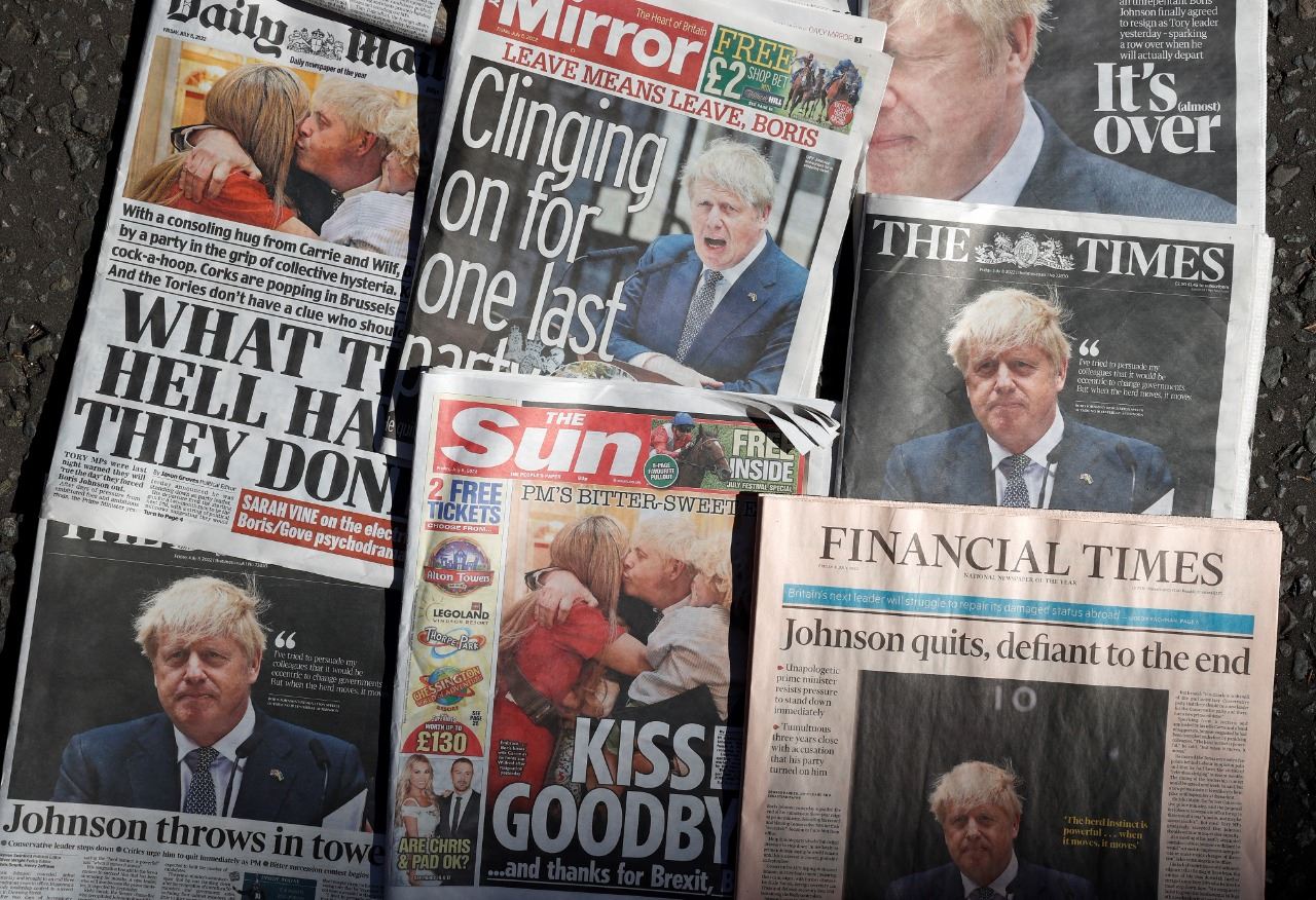 جونسون على الصفحات الأولى لصحف بريطانية رتبت لتصويرها في داونينغ ستريت وسط لندن (8 تموز 2022، أ ف ب).