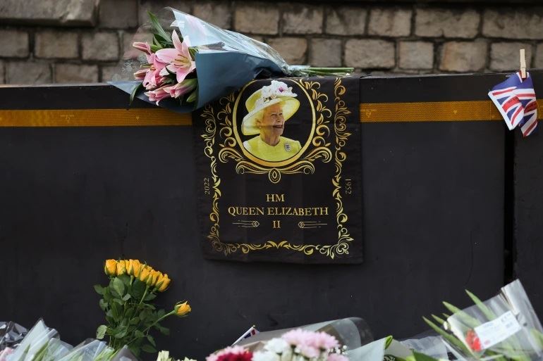 بريطانيون يضعون الزهور على بوابات قصر باكنغهام حداداً على الملكة (أ ف ب).