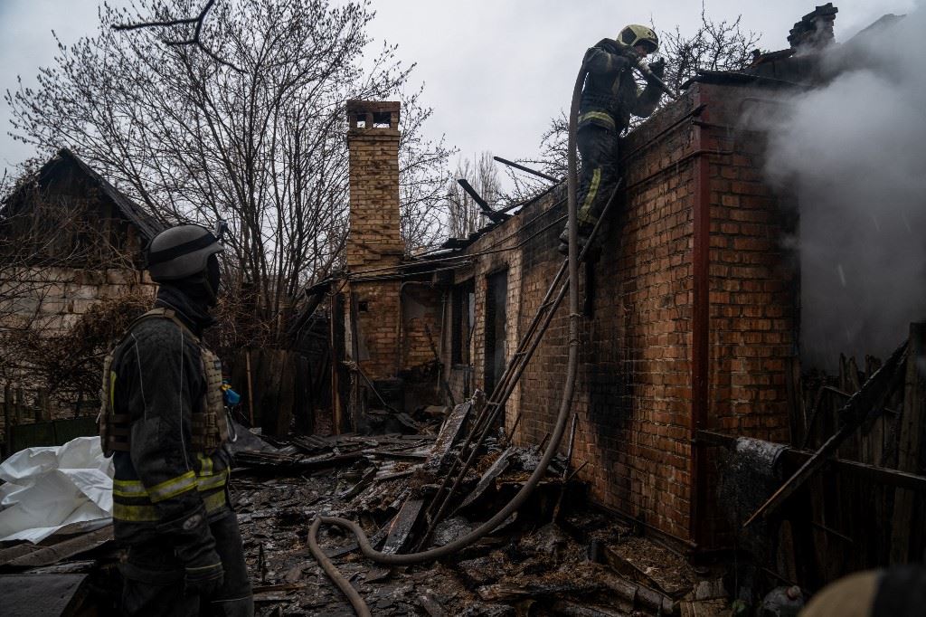 رجال إطفاء يخمدون حريقًا في منطقة سكنية في باخموت بمنطقة دونيتسك (8 ك1 2022، أ ف ب).