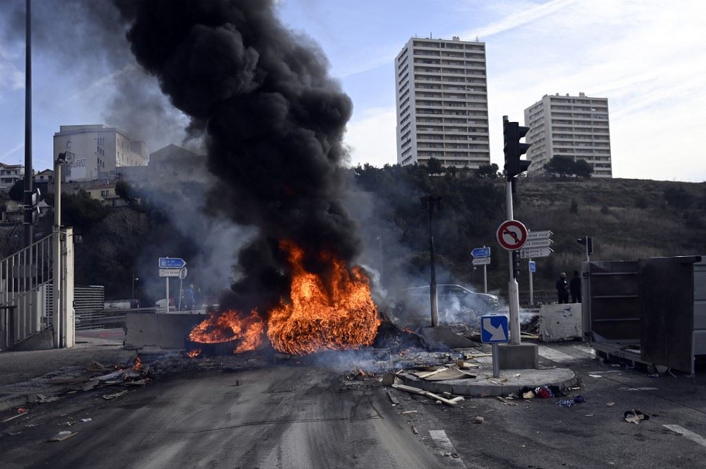 حريق مشتعل عند حاجز أقامه موظفون مضربون في حوض بناء السفن في مرسيليا خلال حصار كجزء من إجراء ضد إصلاح المعاشات التقاعدية (8 آذار 2023، أ ف ب).