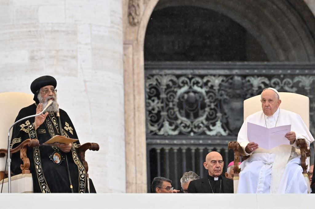 البابا فرنسيس والبابا تواضروس الثاني خلال اللقاء الأسبوعي العام في ساحة القديس بطرس بالفاتيكان (10 أيار 2023، أ ف ب).