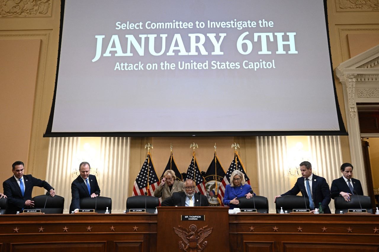 رئيس لجنة التحقيق البرلمانية النائب بيني طومسون (في الوسط) وأعضاء في اللجنة جلسوا في مقاعدهم خلال جلسة استماع للجنة في مبنى الكابيتول هيل في واشنطن العاصمة (9 حزيران 2022، أ ف ب).