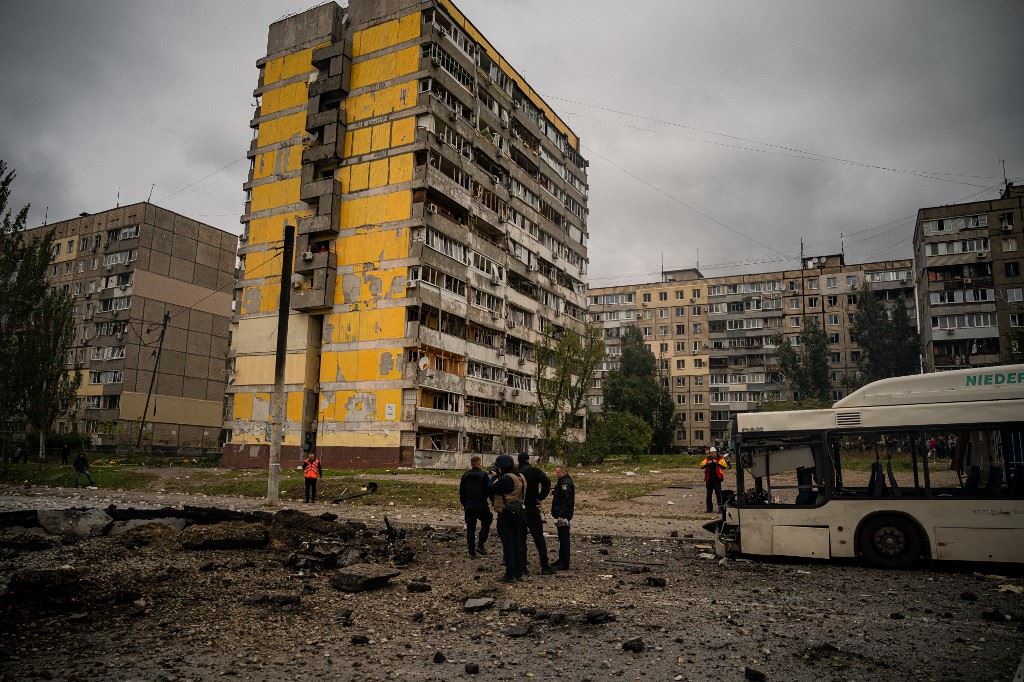 محققون يتفقدون حفرة خلّفها هجوم صاروخي في دنيبرو بأوكرانيا (10 ت1 2022، أ ف ب).