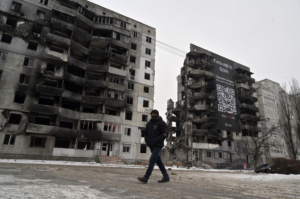 رجل يمر بجوار ابنية مدمرة في بلدة بورودينكا الأوكرانية، على بعد نحو 60 كيلومترًا من كييف (12 ك2 2023، أ ف ب).