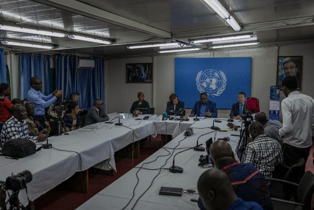 (من اليسار) رئيس بعثة منظمة الأمم المتحدة لتحقيق الاستقرار في الكونغو الديمقراطية بينتو كيتا، سفير فرنسا لدى الأمم المتحدة نيكولاس دي ريفيير، سفير الغابون لدى الأمم المتحدة ميشيل كزافييه أوبيانغ، المبعوث الخاص للأمين العام للأمم المتحدة للبحيرات العظمى هوانغ زيا يشاركون في مؤتمر صحافي في غوما عقب زيارة لبعثة مجلس الأمن (12 آذار 2023، أ ف ب).